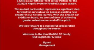 In what is the first of its kind in the Nigeria Premier Football League, new boys, Kun Khalifat, has announced casual dining brand, Old English Bar & Grills, as their front-of-shirt sponsor for the 2025/26 season. Kun Khalifat made the announcement via a post on its Official X account. …